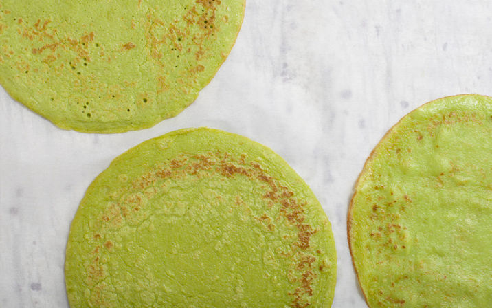 4. Add a ladleful of batter (about 3/4 cup; 175ml) to pan and immediately swirl to form a large, thin pancake. Cook until top of crepe begins to look dry and bottom is starting to brown, about 1 minute. Using a spatula, make sure crepe is free of pan, then flip with a spatula or your fingertips. (You can also toss and catch the crepe if you feel comfortable doing that.) Cook until second side is lightly browned, then transfer to parchment-lined plate or baking sheet.