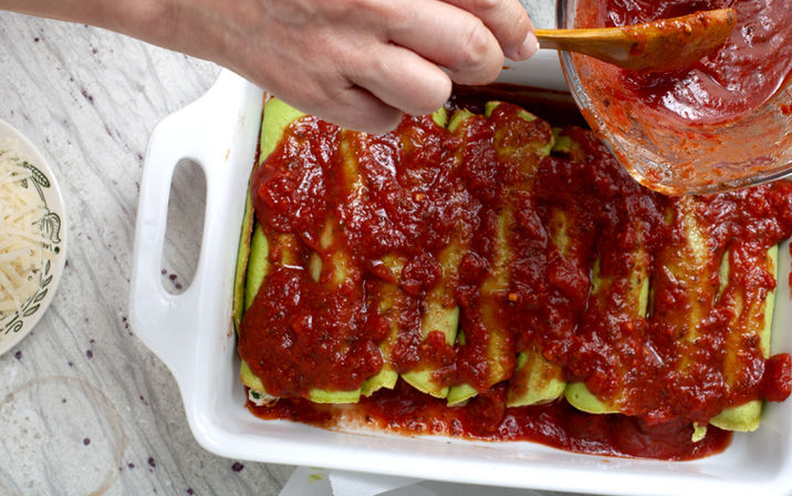 1. Spread approximately 1/3 of your manicotti sauce in an even layer on the bottom of a 12x15-inch roasting pan.